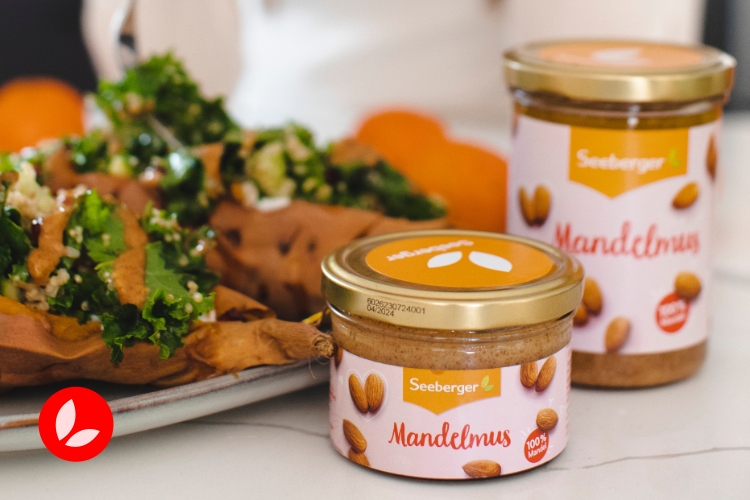 Für das Mandeldressing 2 TL Mandelmus, 1 EL Olivenöl, 2 EL Apfelessig, Salz und Pfeffer in einer Schale vermengen.