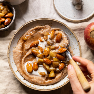 Dieser Winter- Grießbrei ist perfekt für kalte Tage: cremig, würzig und mit einem herrlich karamellisierten Apfel-Mandel-Topping. Schnell gemacht und einfach köstlich!